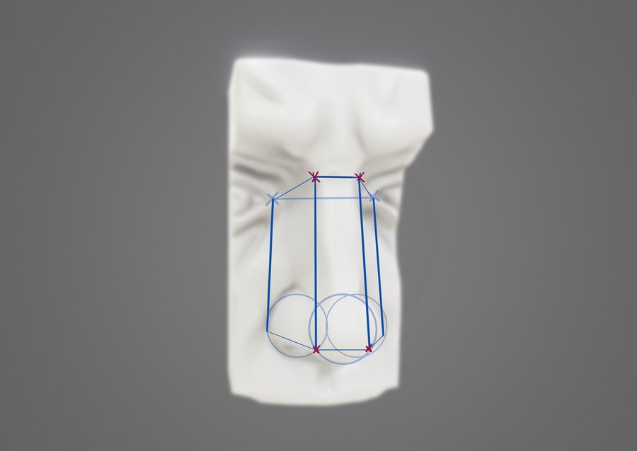 Если ваша модель находится ниже линии горизонта, линии схода уходят вверх, форма гипсовой модели имеет своеобразный «навес» в виде бровей, поэтому начинаем построение с формирования правильной формы.