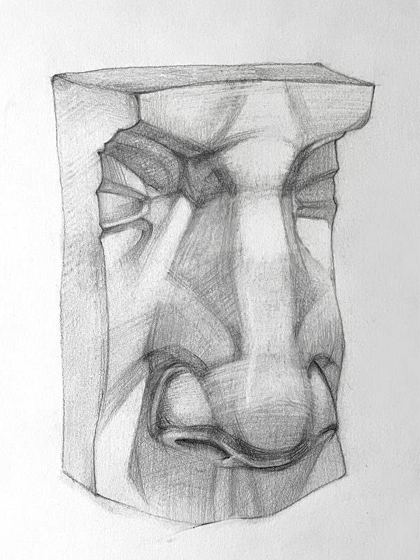 1. Подготовить натянутый планшет для следующего занятия, 2. Используя свой нос как референс, самостоятельно определить различия с носом Давида, и сделать зарисовки. 3. Принести наброски на следующее занятие или загрузить на почту, проконсультироваться.