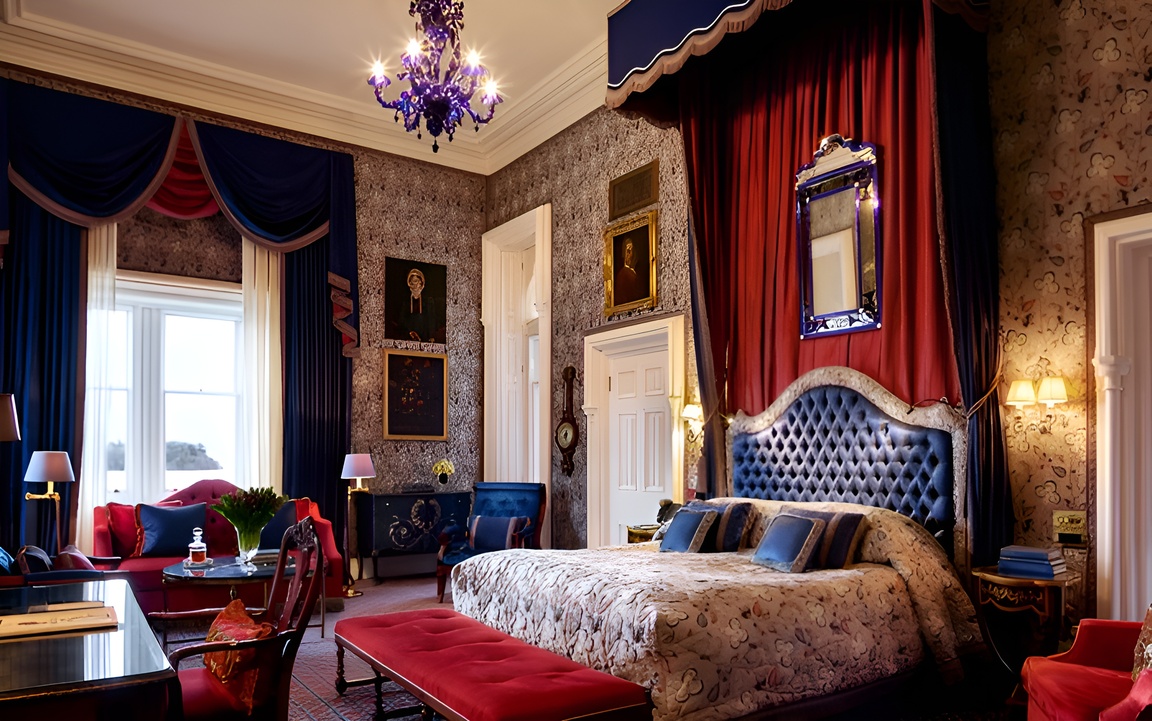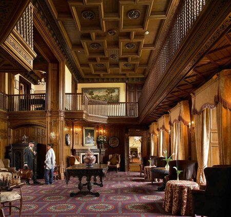 Интерьер выполнен в викторианском стиле. Пространство насыщено различными декором, мебелью и растениями, по заветам викторианского стиля камины есть практически в каждой спальне. Интерьер выполнен в теплых коричневых и бежевых тонах с дополнением бардового, изумрудного, нежных оттенков голубого и разового. Основной материал отделки — древесина,. Она буквально повсюду — потолки, стены, пол.
