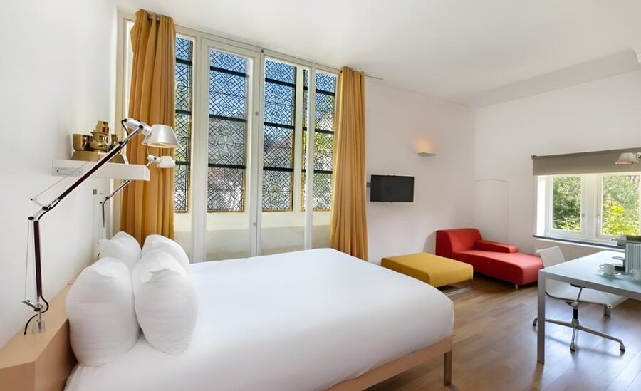 Номера так же не лишены необычных дизайнерских мыслей и юмора, в них отчетливо видно «коробку внутри коробки», яркие цветовые сочетания, местами выпирающие конструктивные элементы, а в ванной комнате можно встретить столик в виде садового гномика. Отель «Kruisherenhotel Maastricht» является интересным примером сочетания современного и исторического.