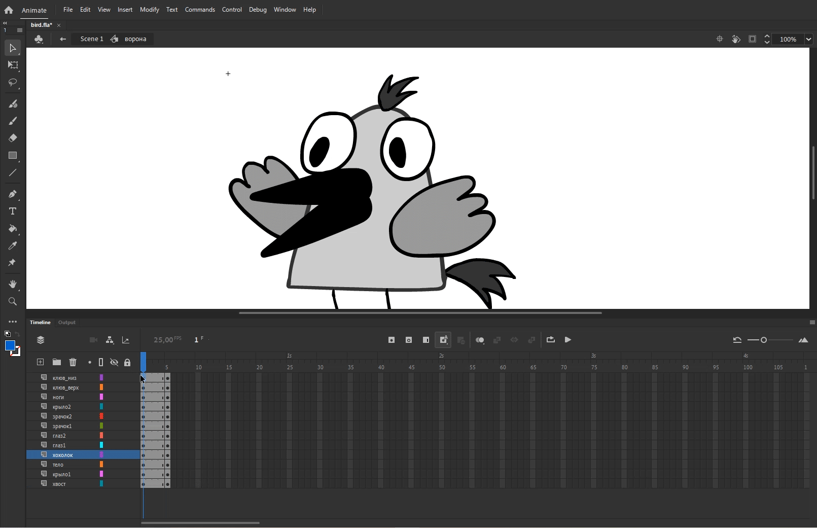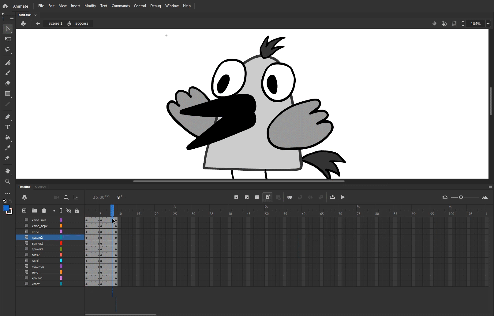 Чтобы вернуться в структуру объекта, нажимаем на ворону два раза. Выделяем все слои с частями вороны, продлеваем ключевые кадры (F5) или просто убираем все выделения со слоев и кадров, кликаем на пустую область шкалы времени, нажимаем F5 и у всех дорожек продлеваются ключевые кадры. С помощью F6 ставим в конце ключевые кадры, которые уже будем редактировать. Это будет новая компоновка, положение нашей птички.