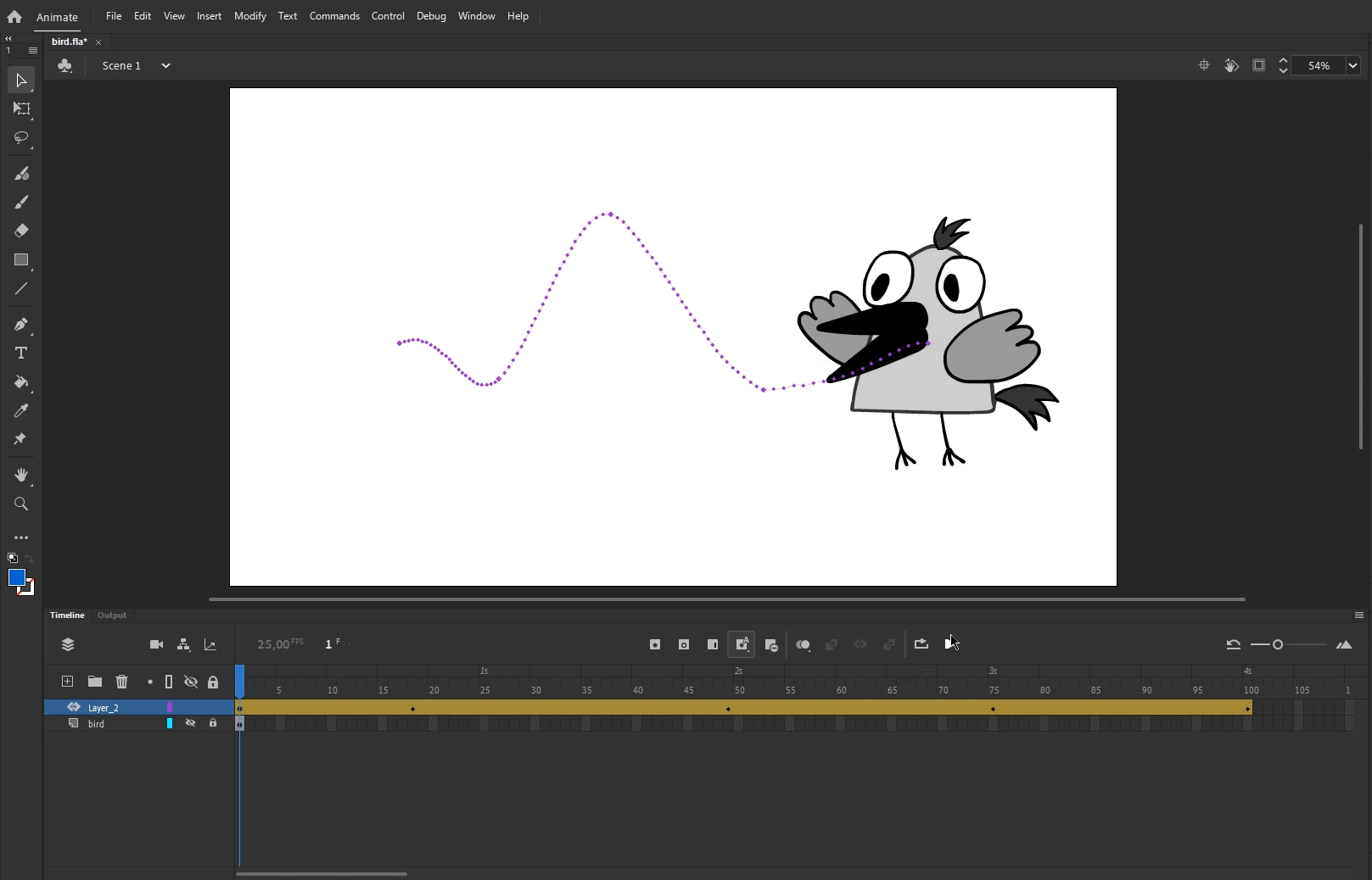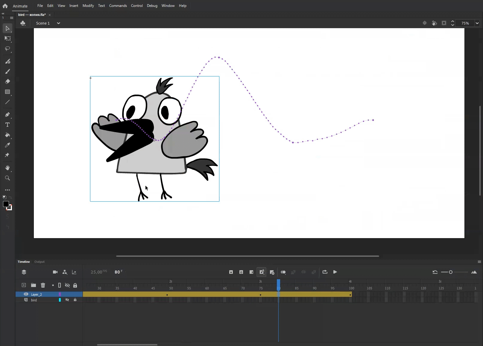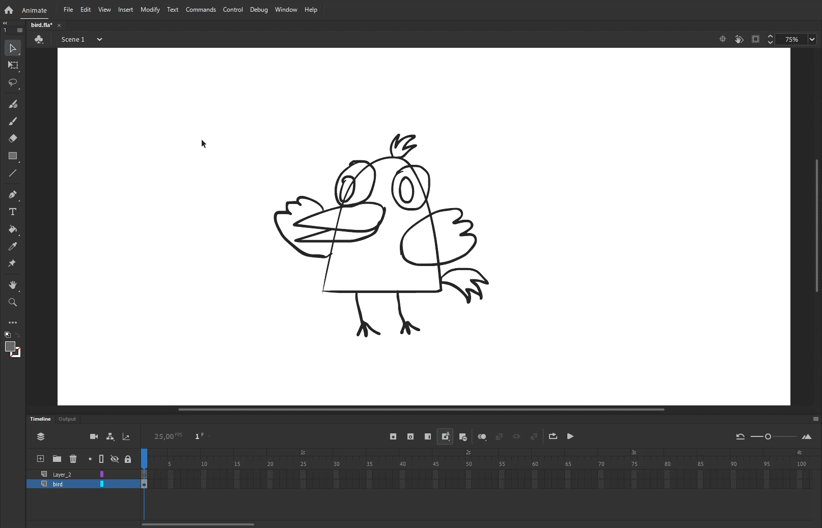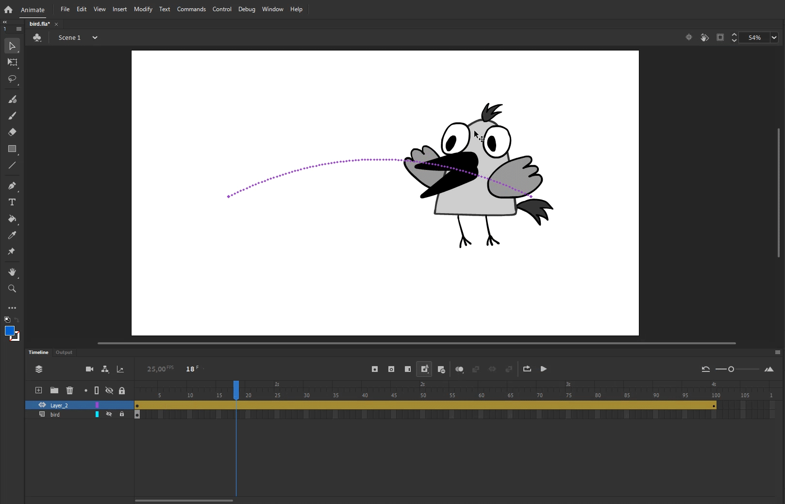 Возьмем Motion tween, популярный вид перекладки, и попробуем анимировать составной объект. Он у нас будет летать, поэтому нарисуем птичку. Только не реалистичную, а с более карикатурными пропорциями, простую.