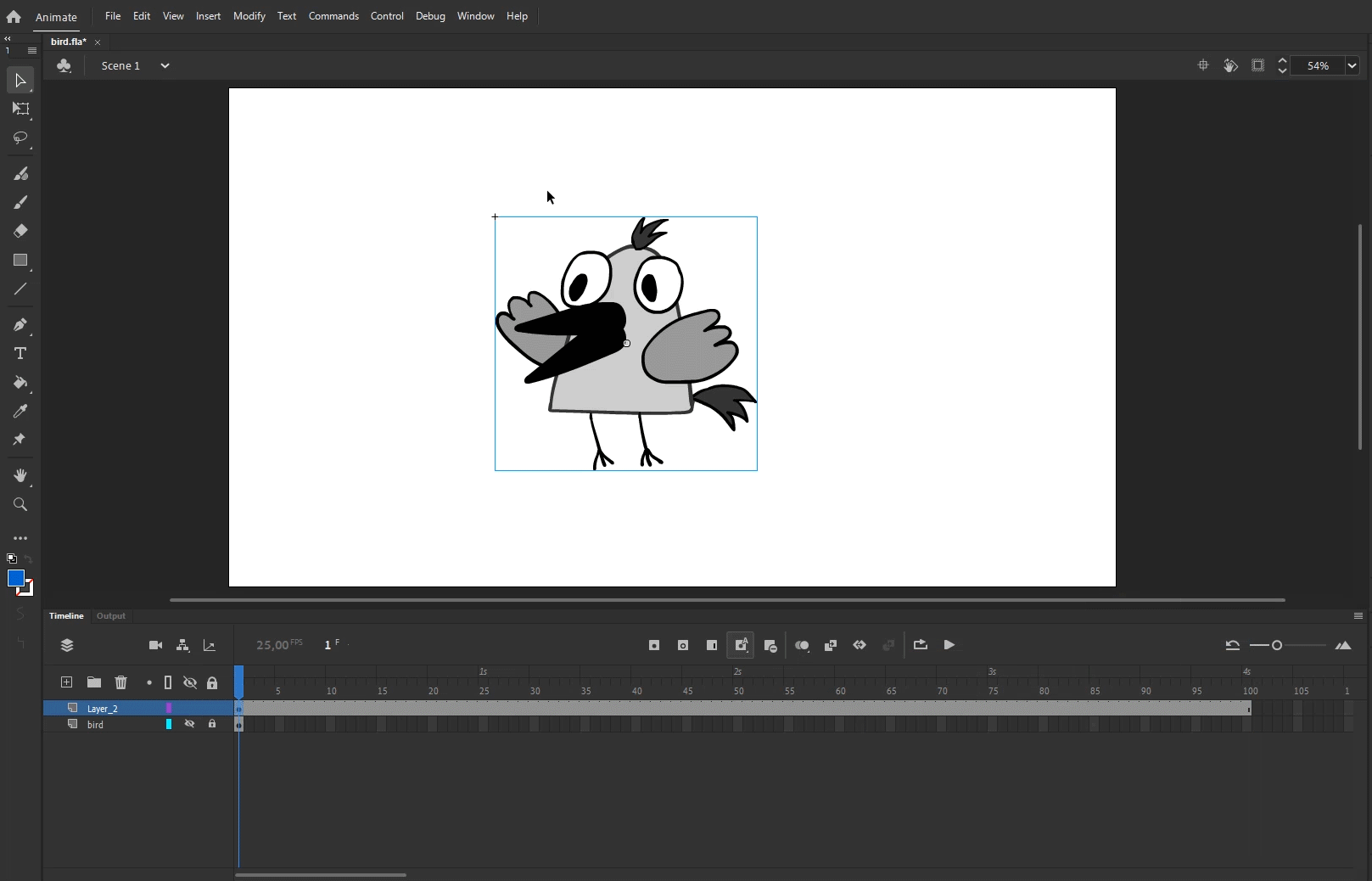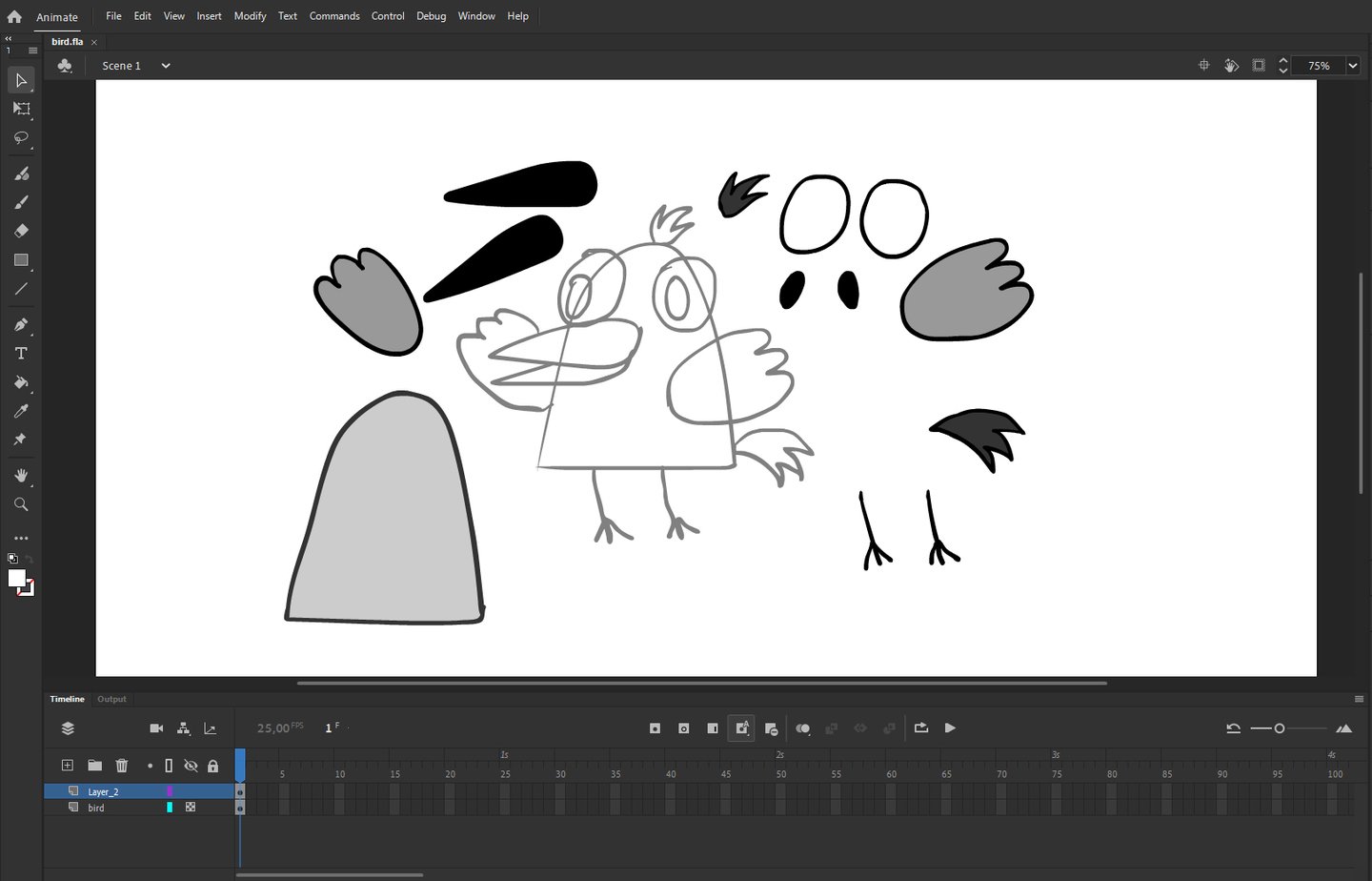 Создаем файл 1920×1080, 25 кадр/сек. Рисуем эскиз птицы, используя кисть, на отдельном слое, группируем с помощью Ctrl+G. Рекомендую на этом этапе освоения программы части объекта делать отдельными, не сливать между собой, так как у нас не покадровая анимация.