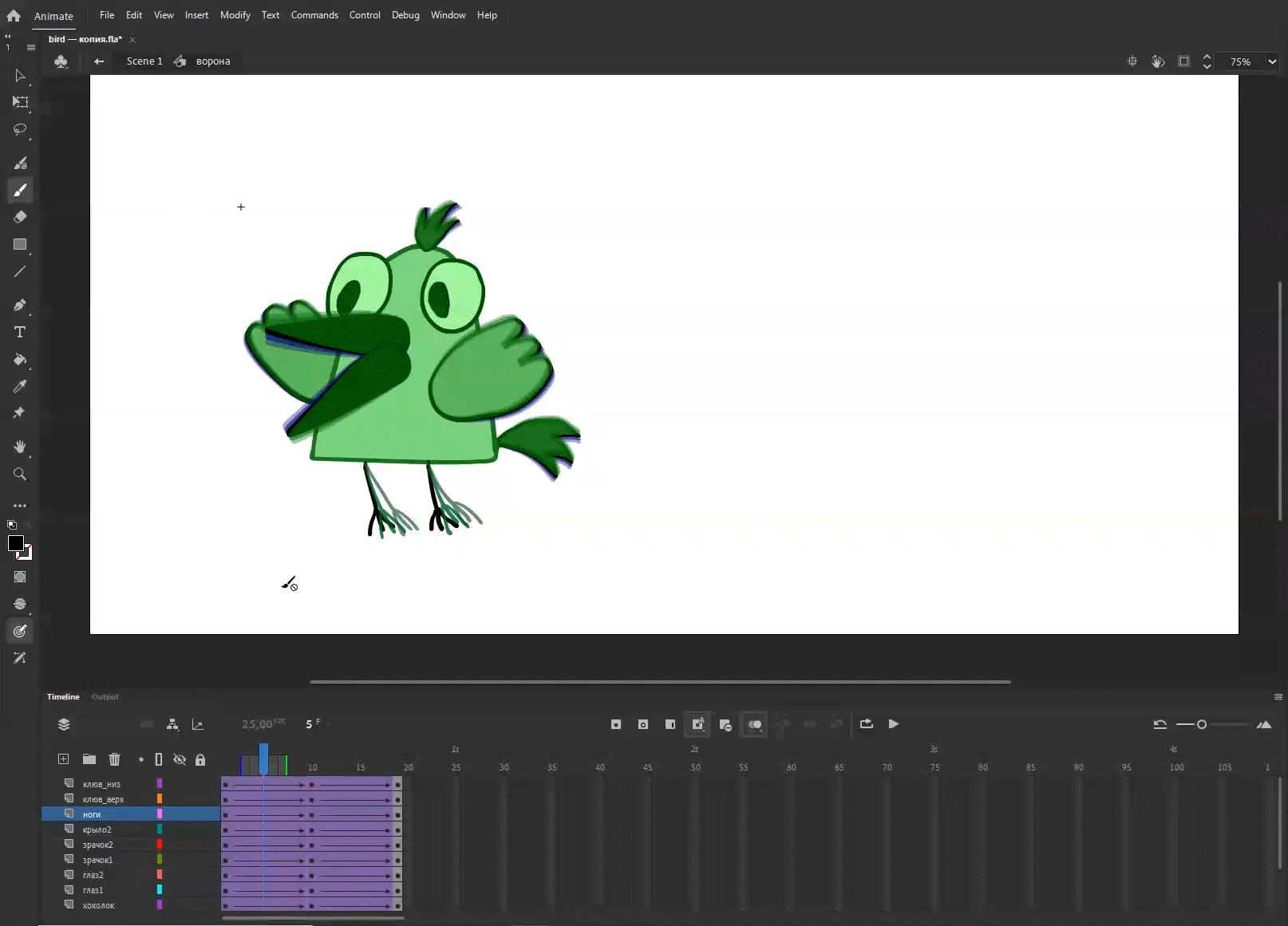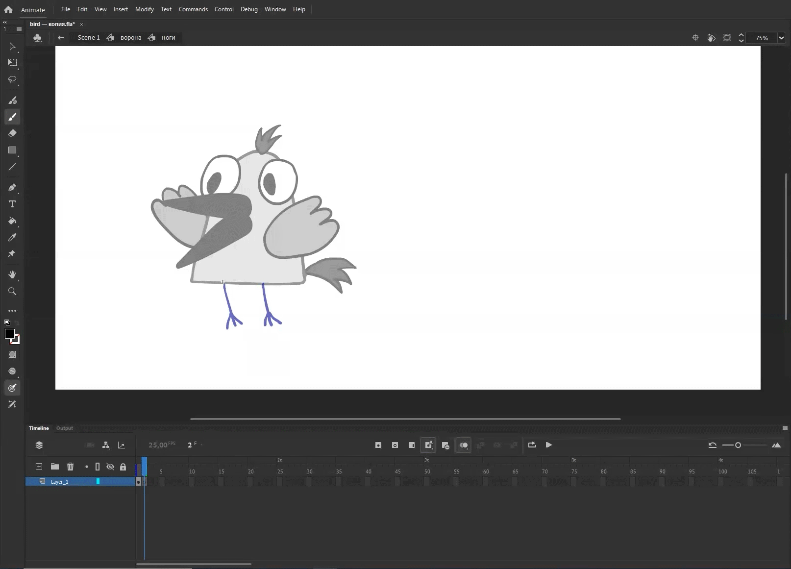 В символах можно использовать покадровую анимацию, если это необходимо. Пусть у нас будут болтаться лапки птички. Для этого нажимаем два раза на ворону, далее на ноги. С помощью F7 создаем пустой кадр, рисуем два раза как бы развевающиеся по ветру лапки, закрепив их сверху и отводя назад. Копируем предпоследний кадр и вставляем после конечного ключа. Нажимая F5, продлеваем ключевой кадр.