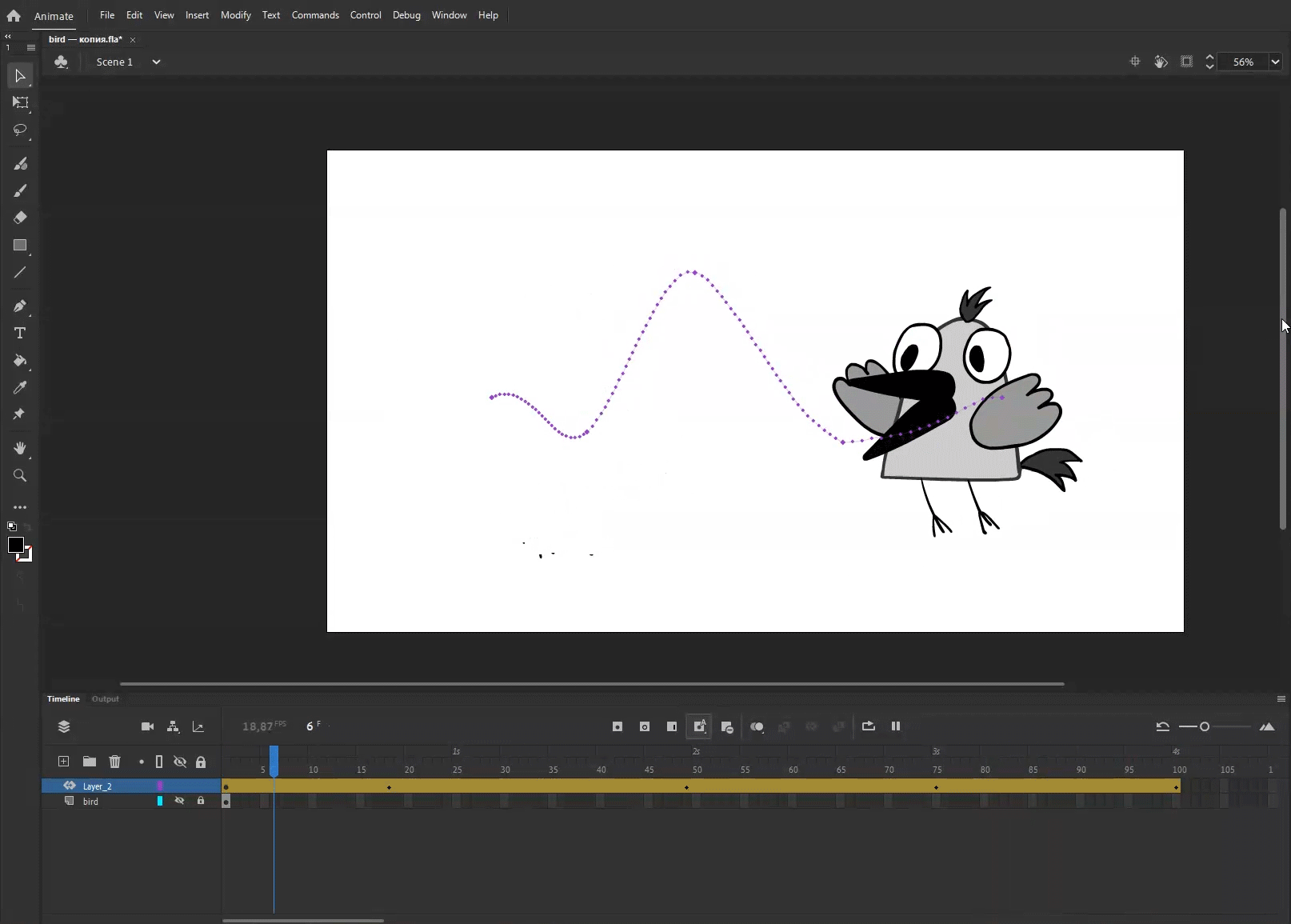 Следующий шаг — выделяем две компоновки и щелкаем правой клавишей мыши, выбираем знакомый нам Create Classic Tween. Первые два ключа окрашиваются в фиолетовый цвет. Во вкладке Control ищем Loop Back и щелкаем. Нажимаем Enter, запускаем анимацию птички.