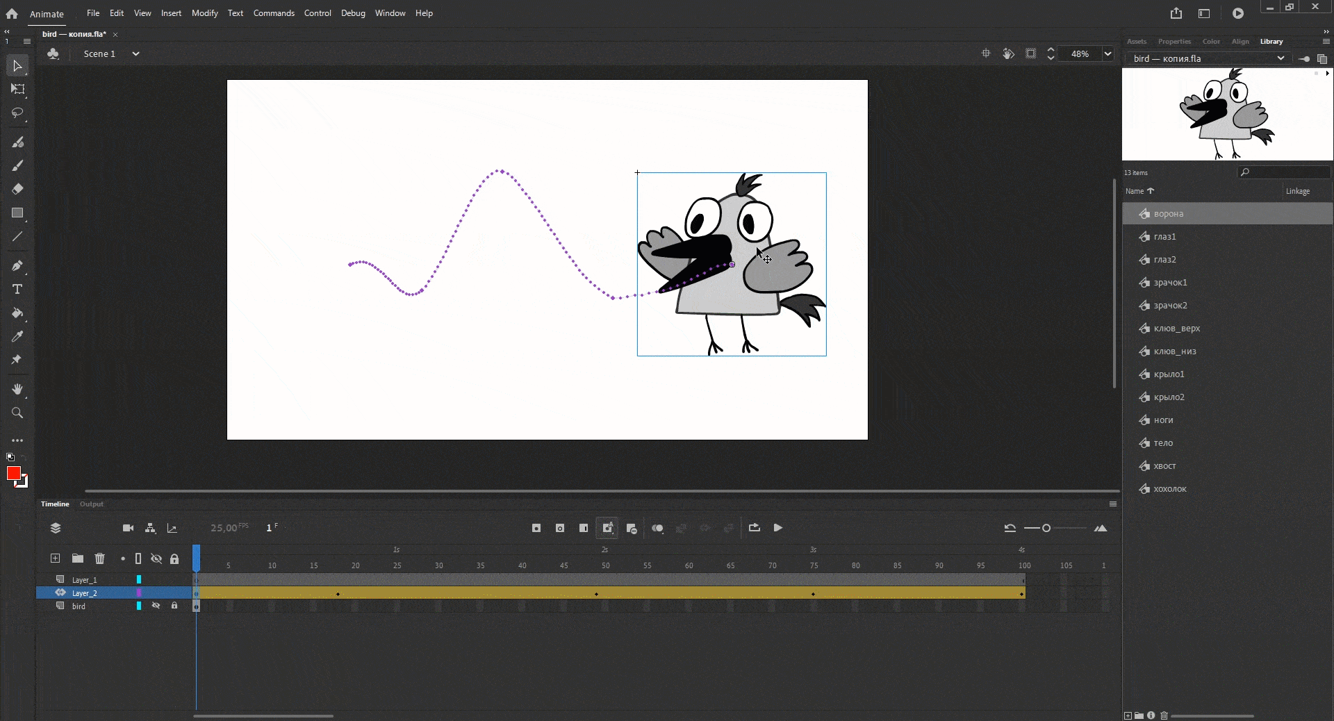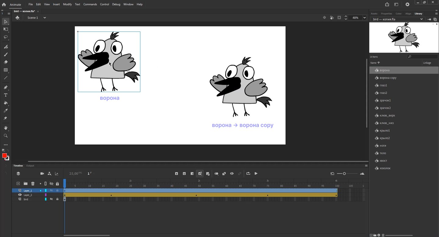 Теперь символ, который мы дублировали, превращается в новый переименованный символ в библиотеке («ворона copy»), мы его не трогаем. Берем из библиотеки оригинальный символ («ворона») и ставим в свободную часть монтажного кадра. Заходим внутрь два раза щелкнув на вторую ворону.