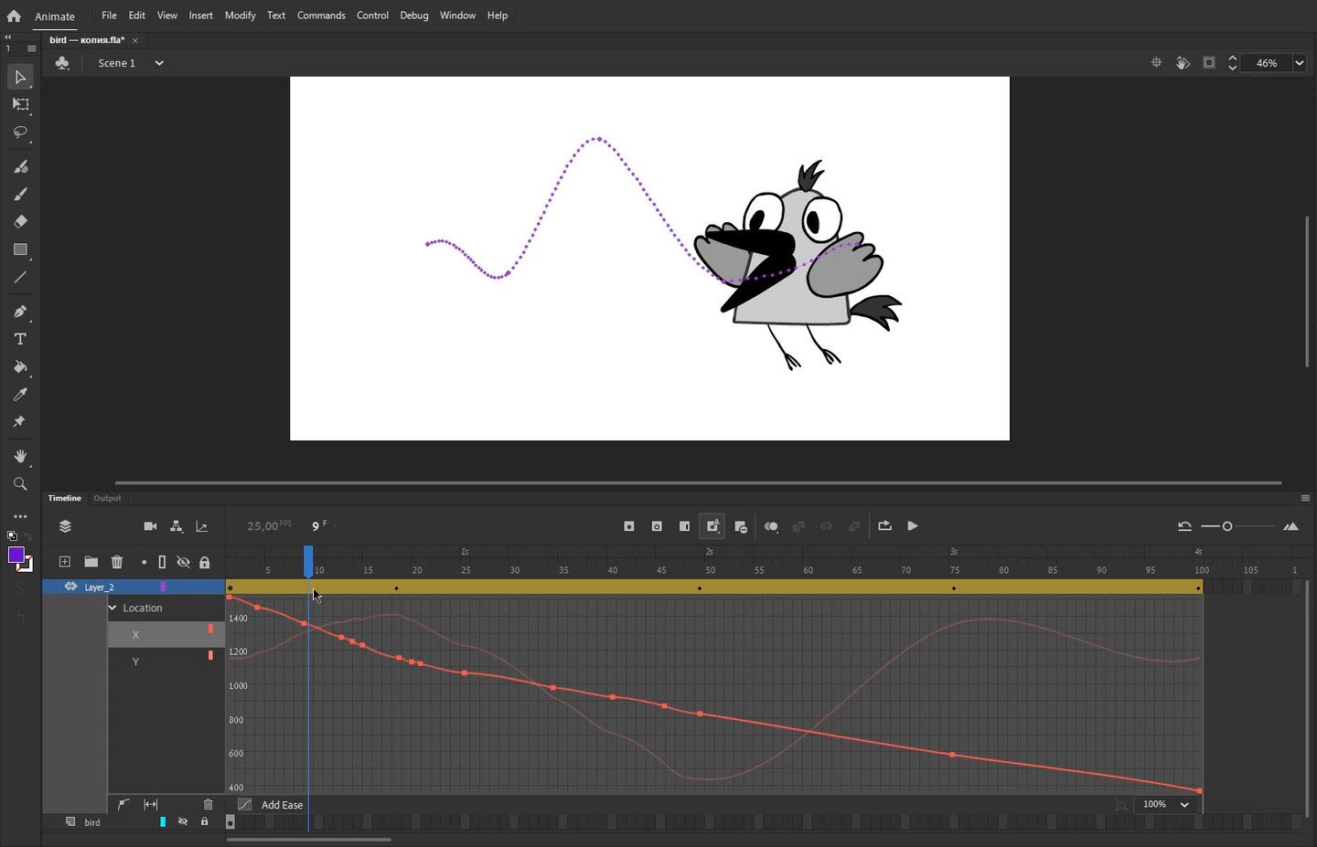 Программа связывает эти два ключа и генерирует траекторию. Курсором искривляем траекторию. Для радикального изменения траектории, достаточно выбрать любой кадр между начальным и конечным и подвинуть ворону.