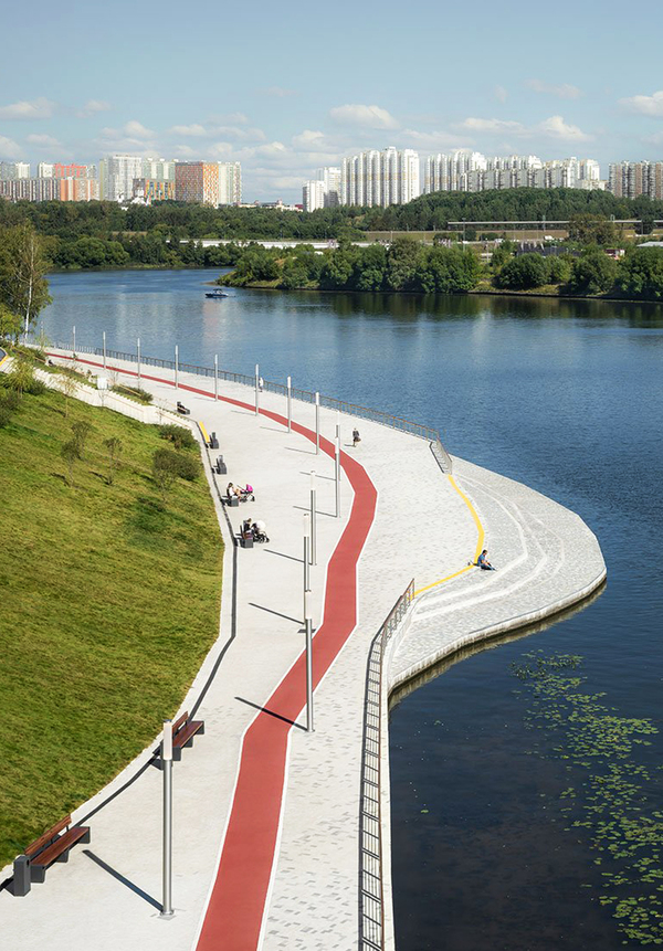 На территории живописной набережной открыт доступ к воде. Криволинейная форма набережной не нарушает экосистему Москвы реки. Прекрасным решением оказалось добавить яркую красную дорожку для бега вдоль воды. По всей набережной размещены детские площадки, выполненные из экологических материалов.