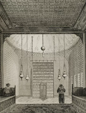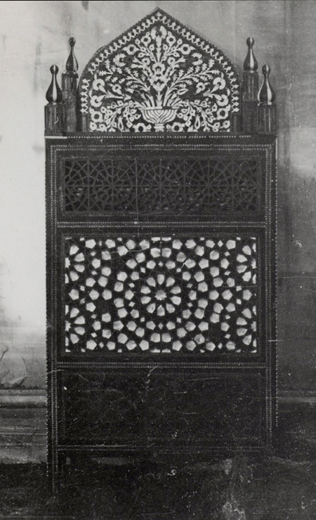 1. Осман Хамди-бей, «Чудотворный колодец (Чтение на арабском)», 1904 г. 2. «Кафедра проповеди с перламутровой инкрустацией в мечети Фатих», фотография.