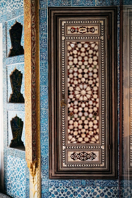 Декоративные узоры перекликаются с Фруктовой комнатой Ахмеда III во дворце Топкапы, например букет цветов на внутренней стороне двери.