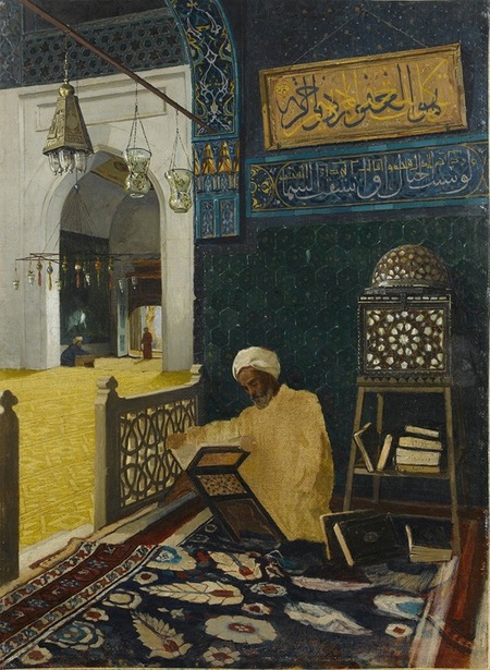 1. Осман Хамди-бей, «Ходжа читает Коран», без даты. 2. Фонарь из мечети Султанахмет, позолоченная медь, 1481–1512 гг, Стамбул, Турция.