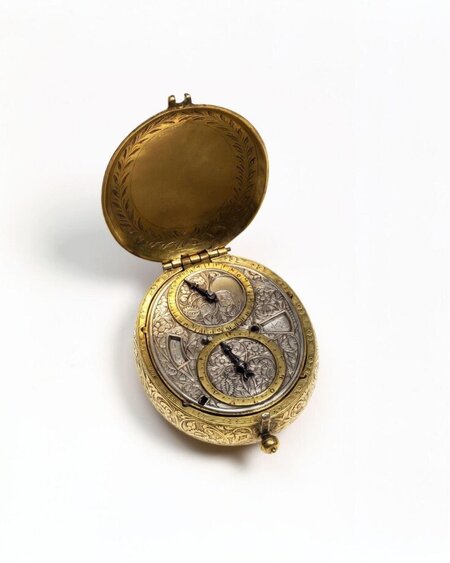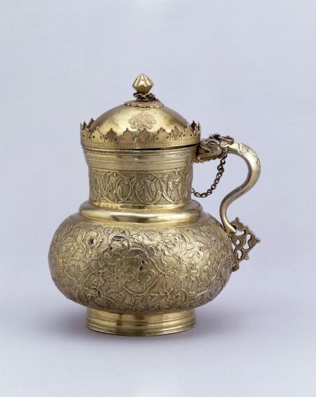1. Жан Патрру, часы, гравированная позолоченная латунь и серебро. Турция или Женева. Около 1670 года; 2. Кувшин, позолоченное серебро, около 1500 года, Турция.