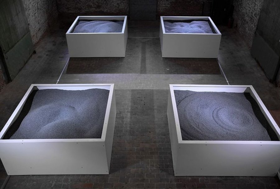 В коробы помещена мелкая галька, движения которой создают рисунки, как те, что возникают на поверхности земли из-за движения тектонических плит.
