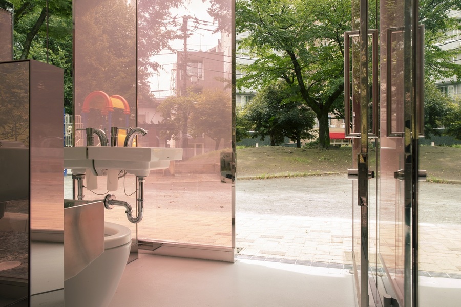 Yoyogi Fukamachi Mini Park Toilet, JAPAN. The glass becomes opaque when locked.