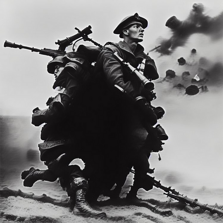 Работа «Безмолвный герой» выходит за рамки чисто эстетического исследования суррогатных реальностей, обращаясь к глубоко личному опыту и коллективной памяти. Художник использует ИИ, архивные материалы и семейные фотографии, чтобы реконструировать военный путь своего деда, ветерана Второй мировой войны.