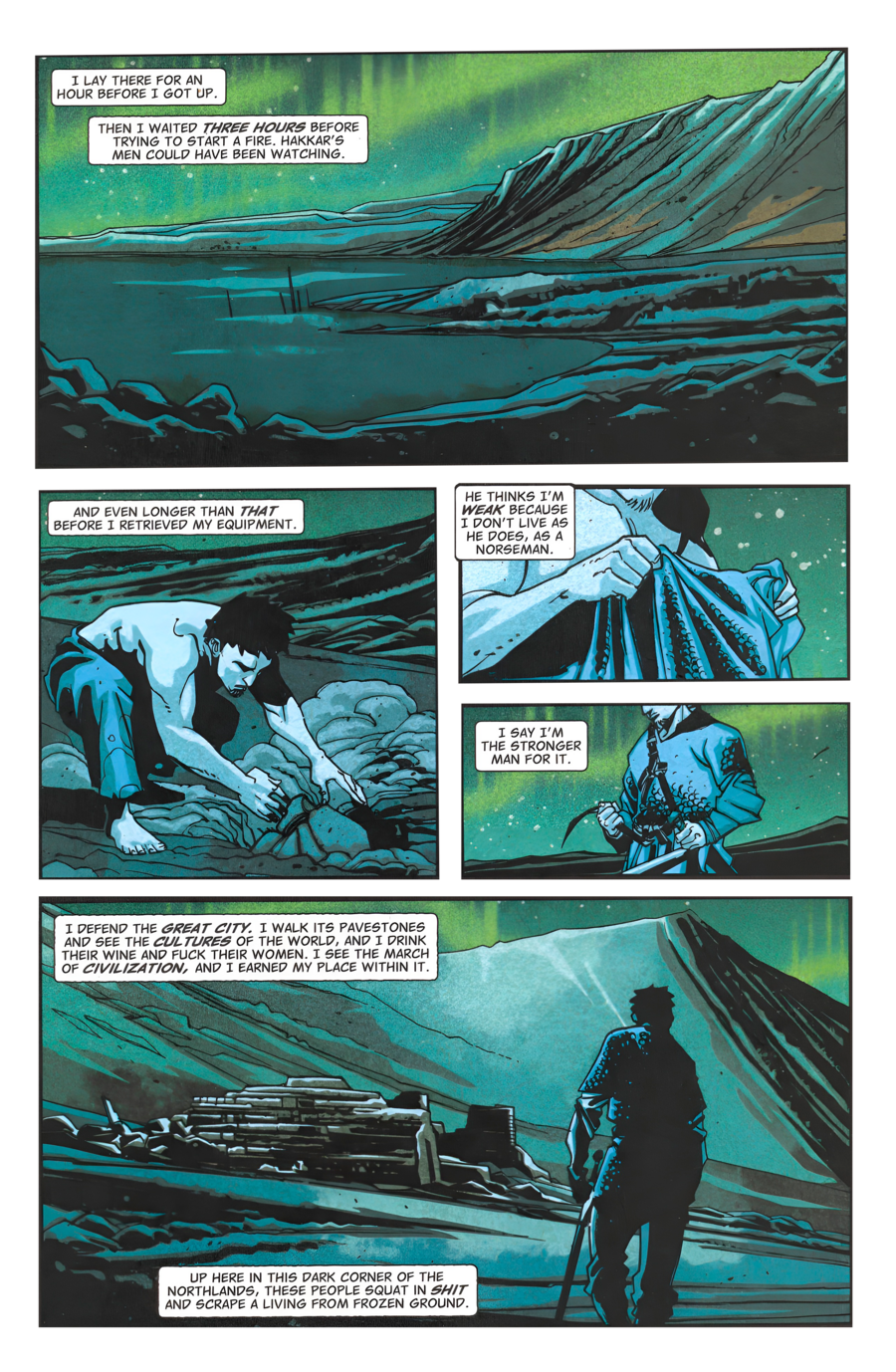 Для героя Константинополь с его величием представляет собой все, чего не хватает родине викингов — культуру, возможности и прогресс. В «Северянах» будто утверждают, что связь с родиной в конечном итоге оказывается более прочной, поэтому Свен и вернулся обратно, несмотря на то, что в Византии он был намного богаче. Этот эпизод вновь доказывает, что Брайан Вуд видел цель не в реалистичном изображении Средних веков, а в обсуждении актуальных тем через средневековый сеттинг викингов. Что и касается языка, на котором говорят герои — актуальный и с руганью, — чтобы современная аудитория лично воспринимала эти диалоги без барьеров.