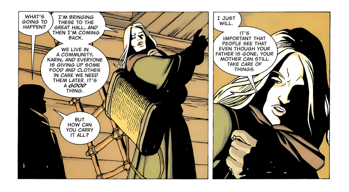 Сексизм — это то, что сразу всплывает при мыслях о Средневековье. Комикс ловко работает на современную аудиторию, добавляя животрепещущие темы — борьба с несправедливостью власти, патриархатом. Что Хильде приходится отныне возглавлять семью и делать то, для чего «у нас [женщин] были мужчины, которые делали это» [рис. 101]. Чтобы доказать свою способность прокормить семью (из себя и дочери), она самостоятельно тащит десятину налога в главный дом старейшине, не прося ни у кого помощи. Образ Хильды и её история отражают реалистичные аспекты жизни женщин в Средние века, но они также адаптированы под современное восприятие гендерных и социальных вопросов. В обществе эпохи викингов гендерные роли были тесно связаны с разделением труда, где женщинам полагалось место в доме, а Хильда пытается вырваться из этого. Такое положение женщин современные зрители и читатели ассоциируют с эпохой викингов и Средневековьем в целом, о чем и говорит Карл Альвестад в своей книге «Средние века в современной культуре: история и аутентичность в современной медиевистике».