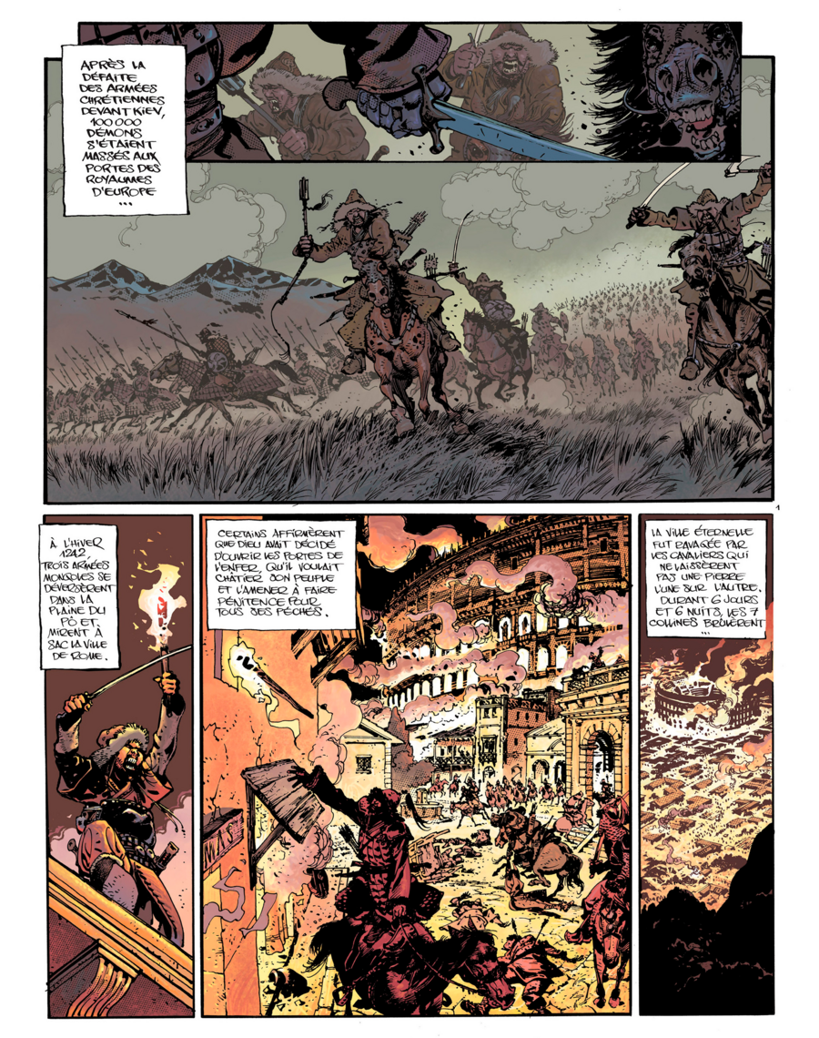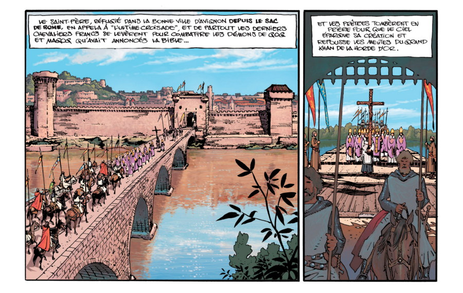 Для большего реализма в комиксе присутствуют панорамы средневековых городов. К примеру, Каракорум — столица монгольской империи. Хоть комикс и представляется как полностью выдуманная история, но в нем присутствует сильный средневековый сеттинг: города, жители, религиозные деятели. А изображение такого могущественного города, как Каракорум, подчеркивает исторический масштаб событий. Авторы комикса используют исторические декорации, но адаптируют их в угоду нарратива.