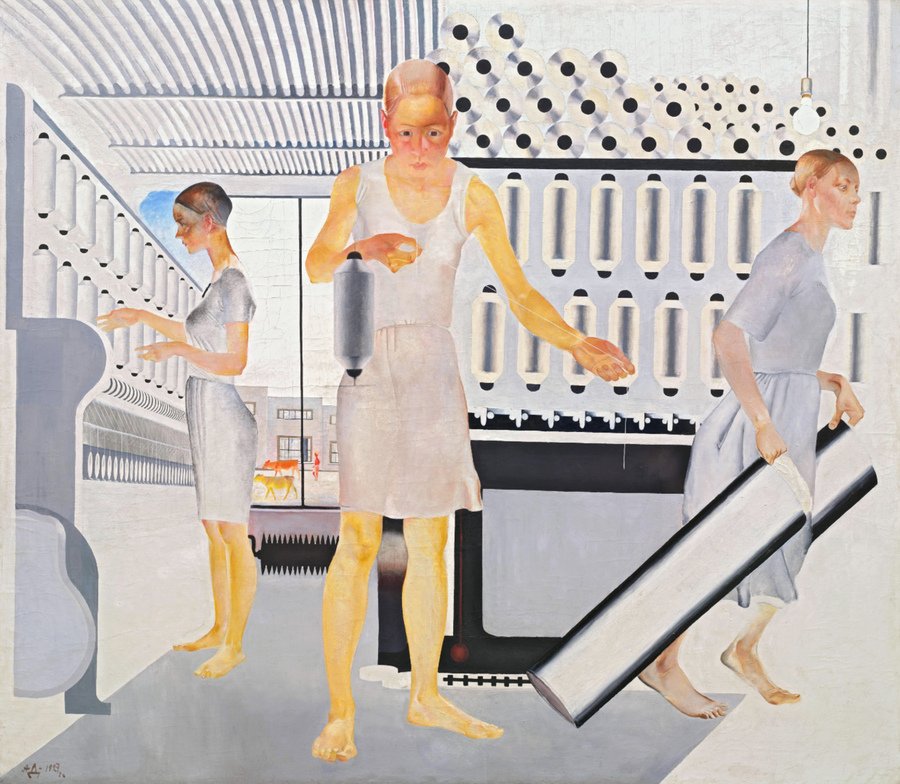 А. Дейнека. «Текстильщицы» (1927, Русский музей); Ю. Пименов. «Даёшь тяжелую индустрию!» (1927, ГТГ)