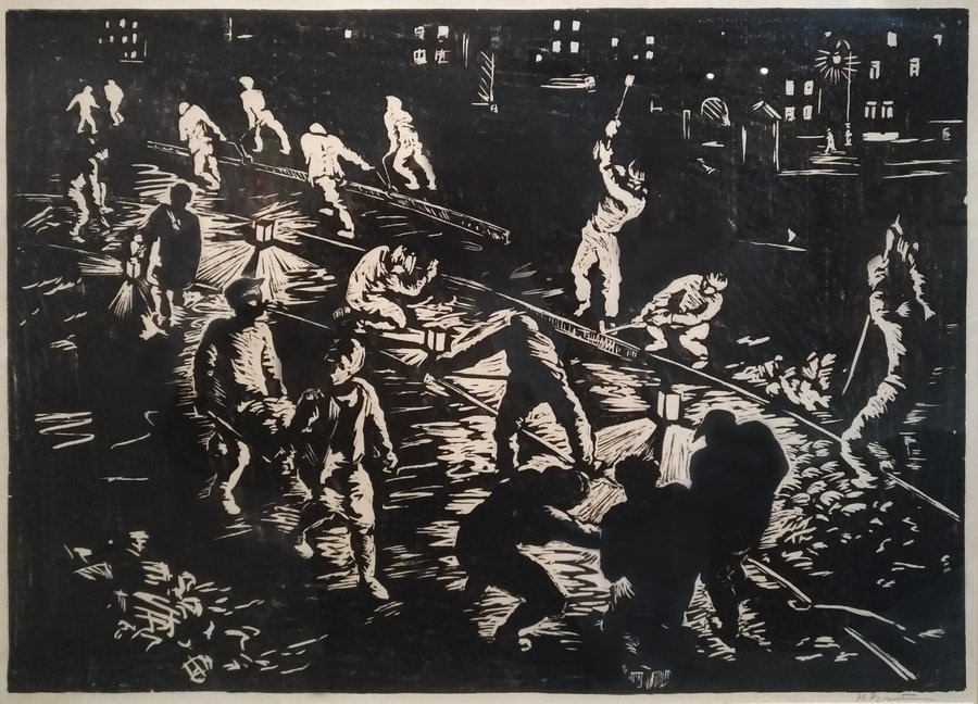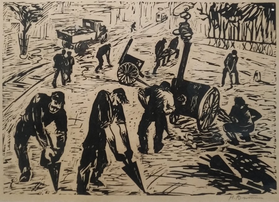 Н. Витинг. Серия «Труд и жизнь»: «Укладка брусчатки», «Ремонт трамвайных путей». (1930, музей «Новый Иерусалим»).