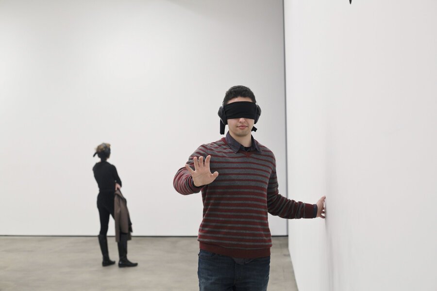 Почему работа мультисенсорна Художник смещает фокус с зрительного восприятия. В условиях ограниченной видимости участники начинают двигаться намного более осторожно, ощущая положение своего тела в пространстве и по отношению к другим людям. Слух помогает понять, где нужно притормозить, чтобы не столкнуться с остальными.