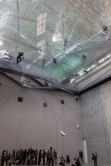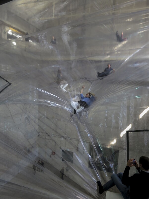 Почему работа мультисенсорна Инсталляция дестабилизирует нас. Мы вновь ощущаем вес и положение тела (проприоцепция), чувствуем материал работы (тактильность). Так как инсталляция прозрачна, участники видят, что подвешены достаточно высоко в воздухе — отличный повод вспомнить о боязни высоты.