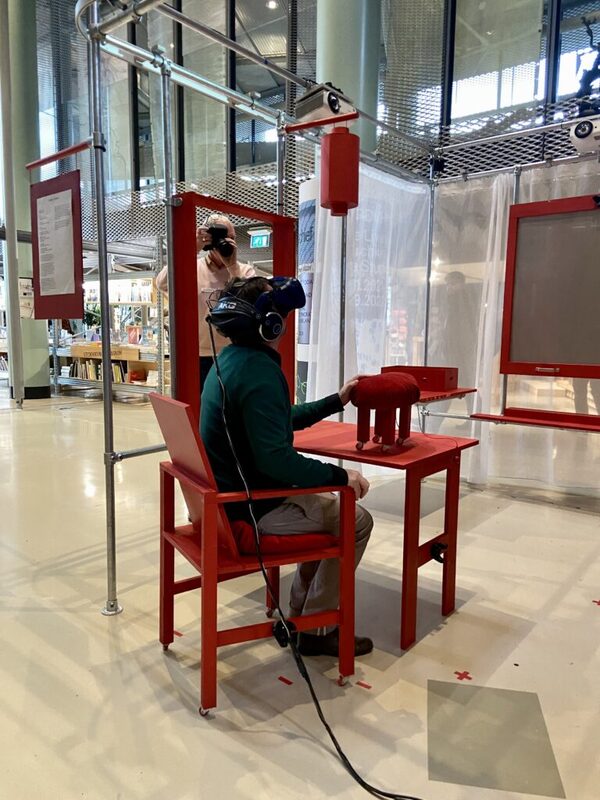 Почему работа мультисенсорна Посетитель трогает вещи, гладит кота, слушает и смотрит виртуальный нарратив в VR-очках. Чтобы не столкнуться с реальными предметами, нужно внимательно следить за положением своего тела в пространстве. Здесь задействовано как минимум 4 чувства: тактильность, слух, зрение, проприоцепция.