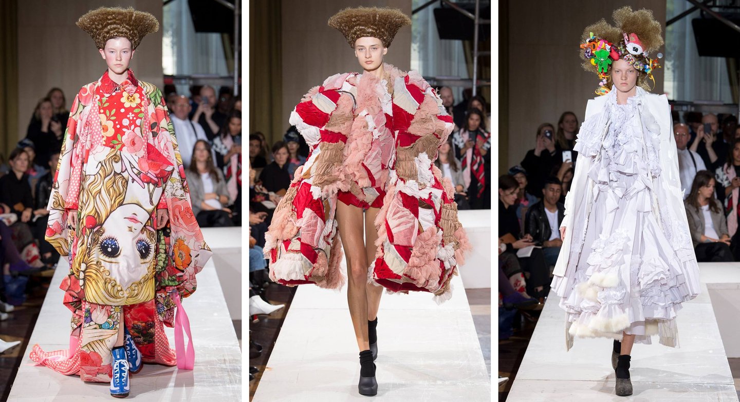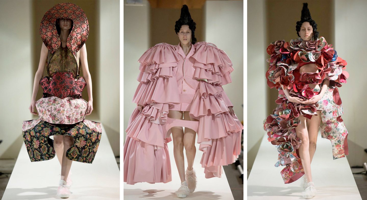 Еще один дизайнер, который часто использует прием утрирования — Рэй Кавакубо, в своих коллекциях она искажает силуэт, традиционные пропорции и линии тела. Коллекции 2016 года посвящена рефлексии о том, как мог выглядеть «Панк XVIII века»: за счет деконструкции, асимметрии и вырезов в узнаваемых элементах рококо — рюши, цветочные принты, жаккард, считывается дух бунтарства.