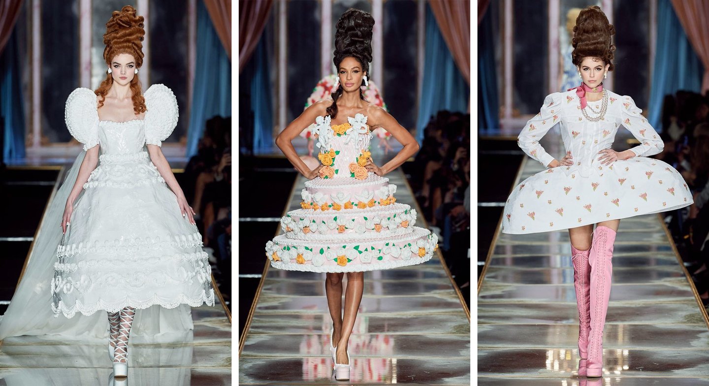 Как я уже упоминала, образ Марии-Антуанетты довольно часто интерпретируют в моде. Но если в предыдущих коллекциях цитирование косвенное, и ее образ считывается на ассоциативном, интуитивном уровне, то в коллекциях 2020 года Thom Browne и Moschino цитирование прямое: высокие пуфы, пышные юбки, панье, выбеленный пудовый макияж, банты, оборки и платья в форме тортов.