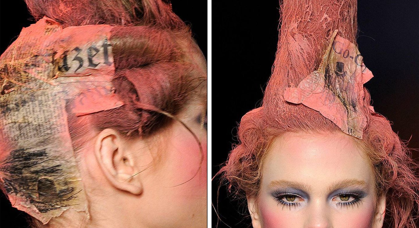 Как упоминалось выше, на многих показах при создании причесок стилисты по волосам вдохновились высокими и сложными прическами XVIII века — пуфами. Как и тогда, сегодня их украшают не просто аксессуарам, бантами, стразами и лентами, но и целыми композициями, фигурками и вообще любыми предметами. Например, на обложке журнала «More or Less», композиция на голове у модели составлена из бумажной и картонной макулатуры, а также пластиковых пакетов — это своеобразный стэйтмент на тему экологической повестки.