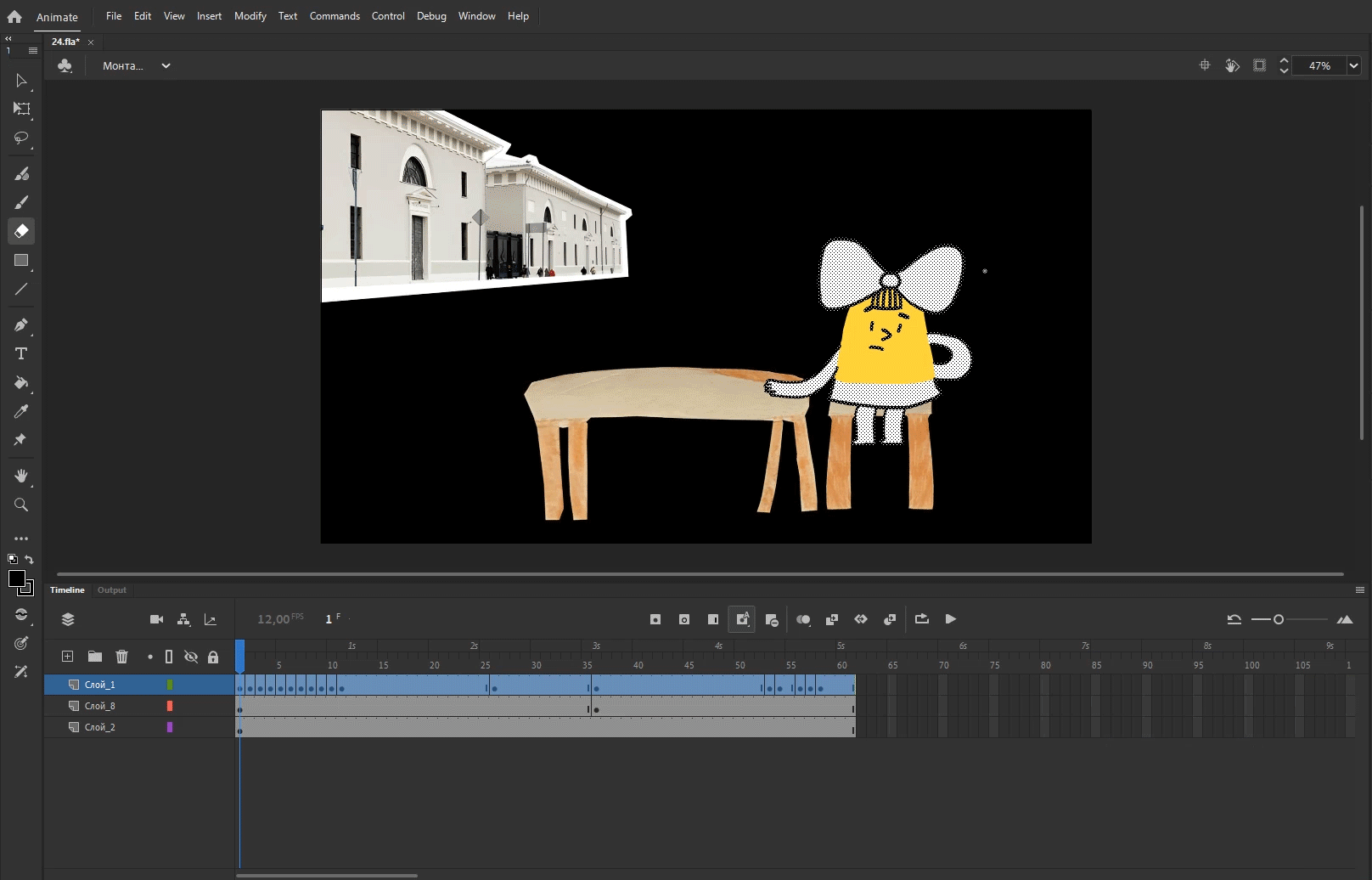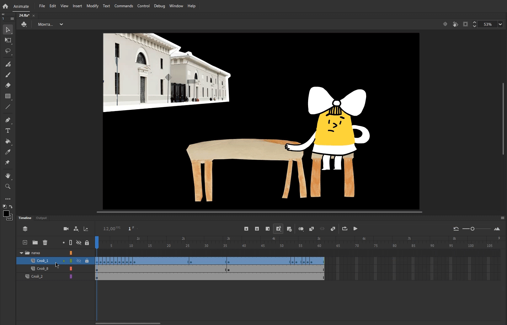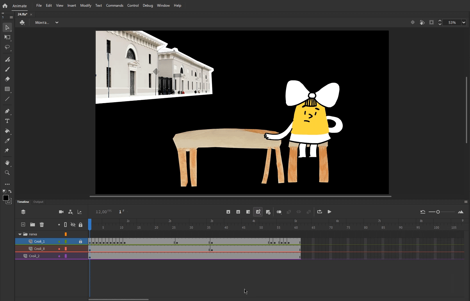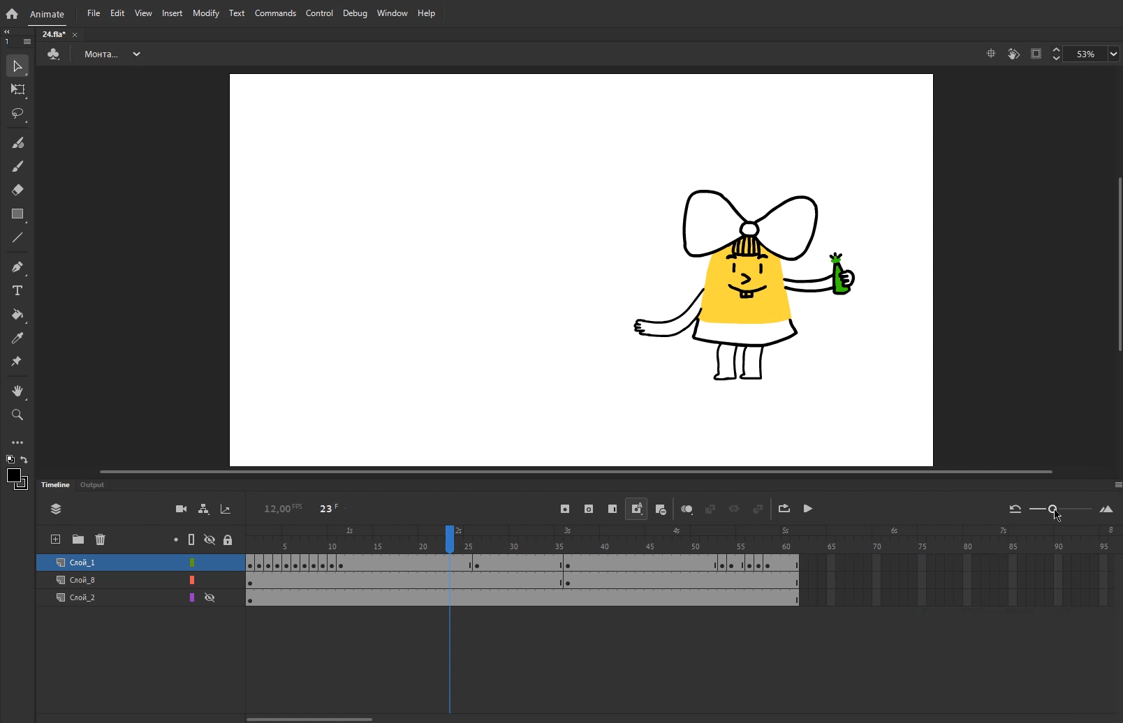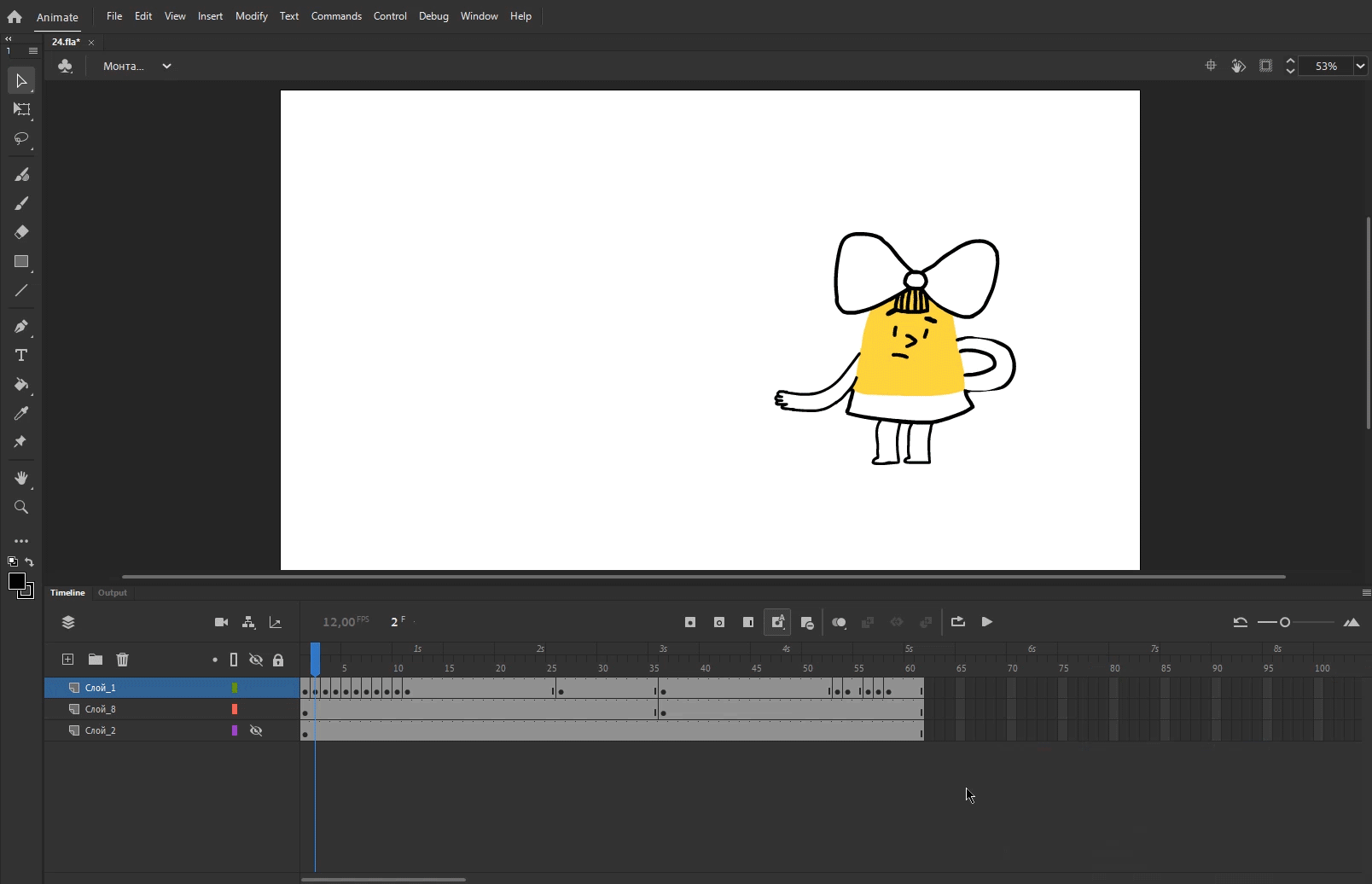 В целом рисовать 12 кадр/сек для учебных работ допустимо, но так как покадровую анимацию и перекладку (изучим эту технику в следующей теме) часто совмещают в Adobe Animate, то лучше брать 25 кадр/сек, особенно для простых упражнений, как наш итоговый проект.