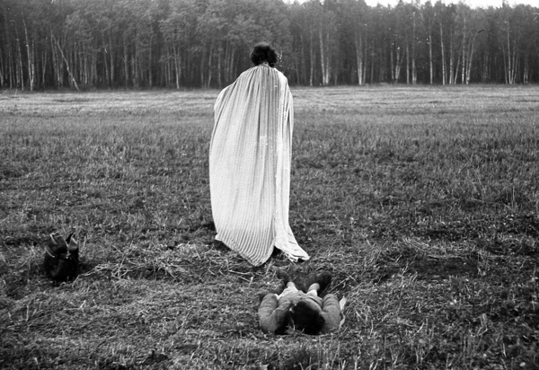 Приехавшие по приглашениям зрители (около 20 человек) были размещены на краю поля. Справа из леса, на расстоянии 50 метров от зрителей, появился участник в фиолетовом балахоне, прошел некоторое расстояние по полю (параллельно линии зрителей) и лег в яму так, что его не было видно. Через три минуты из другой ямы, вырытой на расстоянии 30 метров слева от того места, где исчез участник, появилась его фигура в том же фиолетовом балахоне, но с красным воздушным шаром вместо головы. Проткнув палкой шар, на месте которого возникло облако белой пыли, участник- теперь уже без головы- снова лег в яму, из которой он только что появился. Одновременно с его исчезновением из первой ямы (в 30 метрах справа) появился он же, но уже в обычной одежде, и, засыпав землей яму, из которой вылез, ушел в лес в том же направлении, откуда вышел в начале акции.