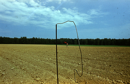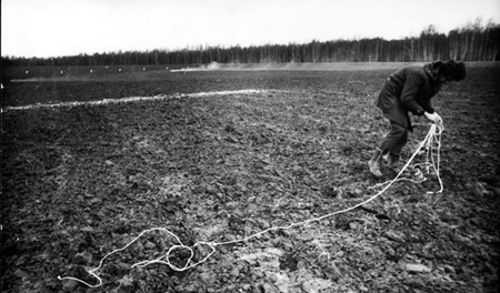 В лесу, не далеко от края поля, между деревьями, была подвешена катушка, на которую предварительно организаторы акции намотали семь километров белой веревки. Катушку подвесили таким образом, чтобы ее не было видно с противоположной стороны поля, куда- через двести метров открытого пространства, по вспаханной земле- был выведен конец веревки и где находились зрители (20 человек) и два участника акции (третий участник во время действия стоял в лесу возле катушки).