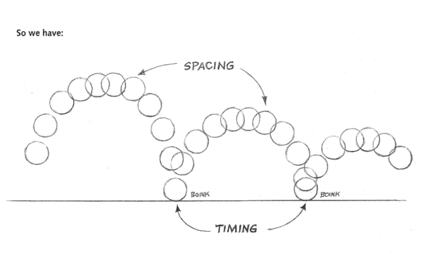 Он также отмечает, что аниматорам необходимо понимать и тайминг (ритм или «удары» действия), и расположение (изменение положения объекта в каждом временном кадре). Уильямс рассказывает, что эти принципы он усвоил от легендарного аниматора Грима Натвика, который подчеркивал, что анимация в основе своей состоит из тайминга и расположения. Он также замечает, что естественный тайминг интуитивно понятен, особенно людям с опытом в музыке или спорте. Однако расположение, требующее внимательного изучения расстояний между кадрами, нужно специально изучать.