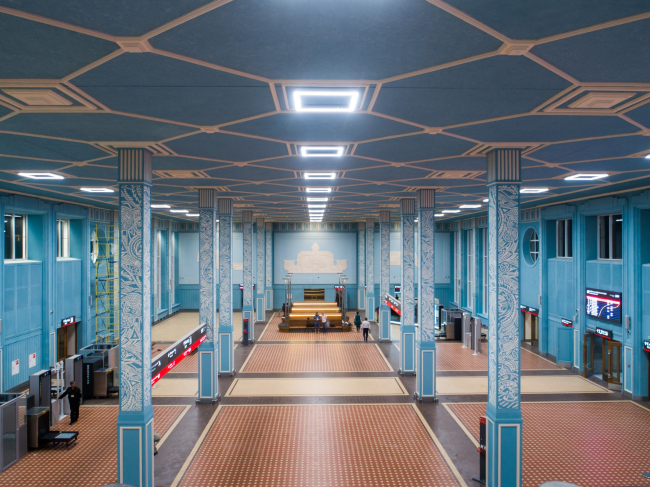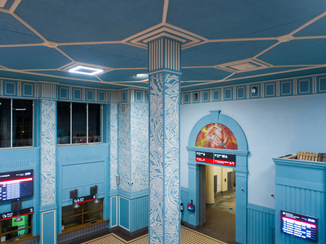Реставраторы рассказывают: «В „синем“ зале был сохранен внешний облик, голубой цвет стен, реставрированы витражи и декоративные элементы из гипса, пол из разноцветной метлахской плитки. Колонны покрыты принтами знаменитых ивановских агитационных ситцев, которые были абсолютным новаторством своего времени и являются визитной карточкой региона». «Синий» зал отражает тенденции архитектурного стиля времени первой реконструкции вокзала, происходившей в 1950-х годах.