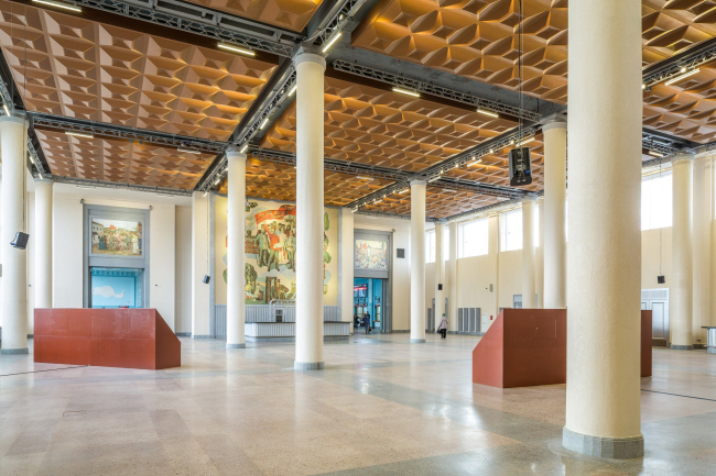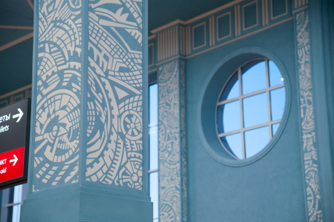 «В „красном“ зале и ранее присутствовали яркие элементы эпохи последнего масштабного ремонта 1980-х годов. Переход из „синего“ зала в „красный“ украшает мозаика. Панно отреставрированы, подсвечены и обрамлены. Переходы между залами увеличены, что подчеркнуло масштаб и задумку первых архитекторов железнодорожного вокзала. Главный элемент „красного“ зала — потолок, покрытый элементами из анодированного алюминия, а также гравировка в центре — символ Олимпиады — 80»