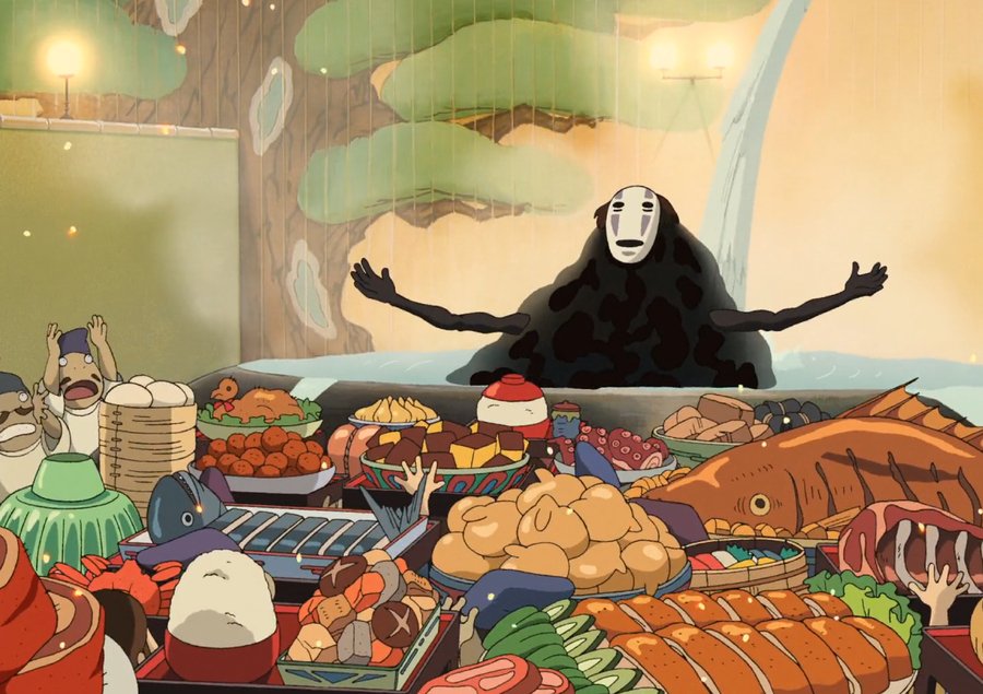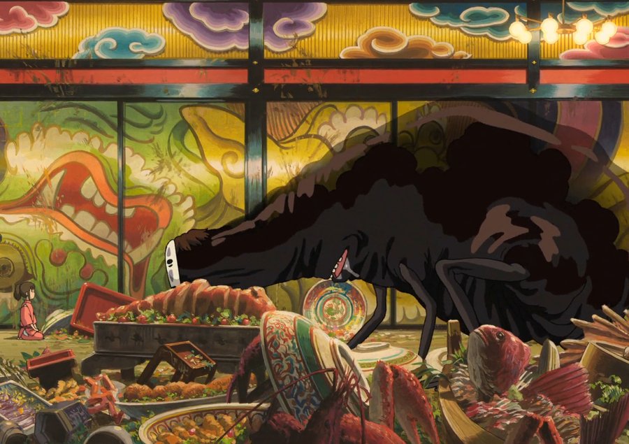 Проглотив одного из работников купален, Безликий перенимает негативные черты характера местных жителей и сотрудников: их жадность и ненасытное потребление. Он закидывает духов золотом, а те приносят ему самые роскошные блюда, пока тот расплывается в темную липкую массу. Стоит вспомнить «Инуясю» — маска Но на черной жиже ожидаемо вызывает неприятные ощущения у зрителей.
