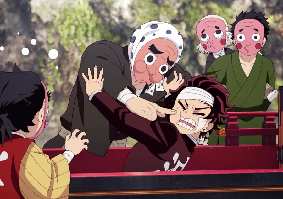 «Клинок, рассекающий демонов» уже появлялся в предыдущем разделе исследования, но разнообразие масок в данном анимационном сериале требует разбора нескольких персонажей. Так, если Сабито и Макомо носили узнаваемые маски кицунэ, то в дизайне героя этой части авторы совсем не обращаются к нежным утонченным ёкаям.