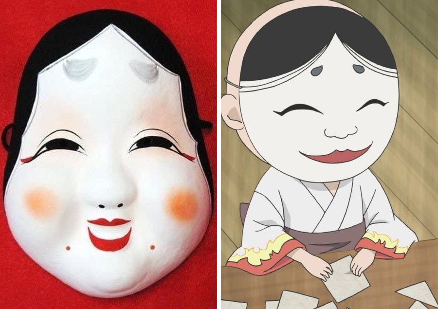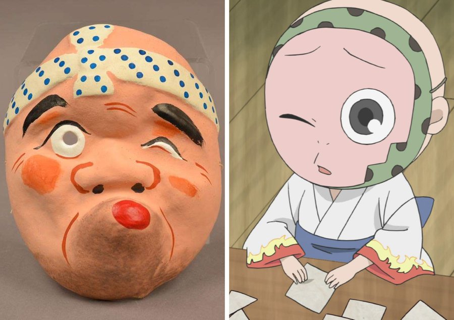 Маски хёттоко и окафуму (слева), скриншоты из «Очень приятно, бог» (2012) реж. Дайти Акитаро (справа)