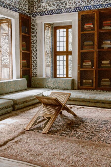 Внутренняя планировка павильона имеет симметричную структуру и внутреннее зонирование на прихожую и зону чтения. Основной зал читальной комнаты украшает низкий диван, обрамляющий помещение с встроенными стеллажами для книг и раскладными подставками под чтение Корана. Помещение также могло быть использовано как переговорная комната султана.