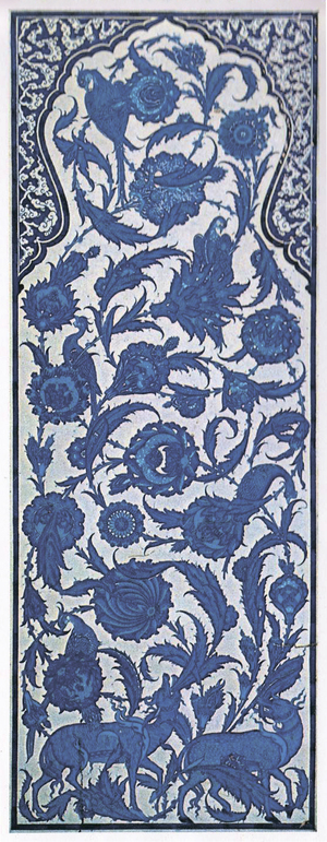 Интерьер павильона облицован большим количеством глазурованных изникских изразцов в виде птиц и цветов в белой и голубой глазури.