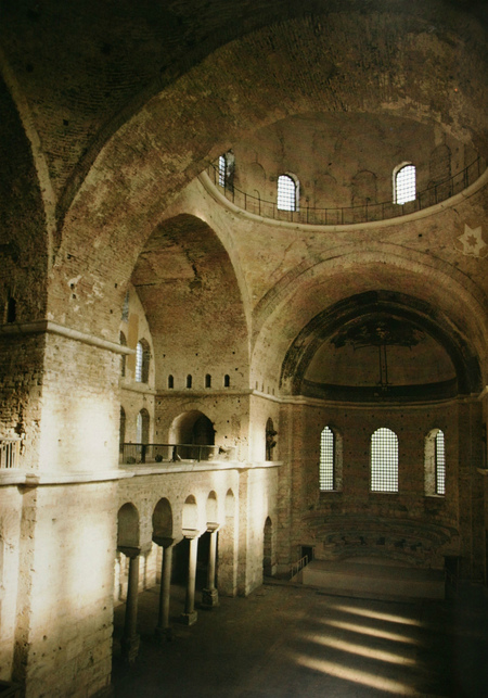 Можно рассмотреть два исторических периода постройки храма: начало IV века и реконструкция после пожара VI века. Важно заметить, что историческая часть находится на первом ярусе, а своды, хоры и купол относятся к VI веку. Таким образом на нижнем уровне здание представляет собой купольную базилику, а выше — крестово-купольный храм.