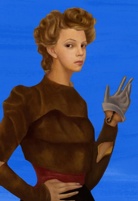 Леонора Кэррингтон на автопортрете 1937 года изображает себя в треугольной композиции: в пустом помещении акцент стоит на ней, открытом окне, в нем видно белого коня, и гиене. Гиена — это особый образ для художницы, значение которого наиболее полно раскрывается в ее рассказе «Дебютантка», по сюжету которого состоятельная девушка договаривается со своей подругой-гиеной, чтобы та подменила ее на балу в ее честь. Для этого гиена переодевается и «натягивает» на себя лицо убитой служанки в качестве маски, но обман все же вскрывается из-за запаха животного, и гиена сбегает. Так Кэррингтон разоблачает неискреннее светское мероприятие, как маскарад, а также формулирует образ «бунтующего внутреннего зверя», игнорирующего навязанное женщинам поведение. Таким образом, жест гиены, протягивающей лапу художнице, сидящей в андрогинном жокейском костюме, во многом позволяет трактовать картину, как упражнения в поиске и отстаивании женственности, декларации суверенитета.