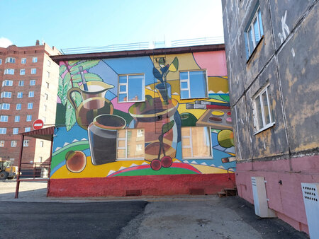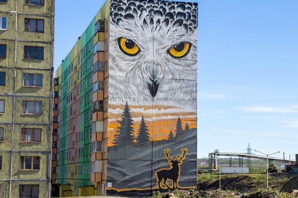 Эволюция цветового кода Норильска не остановилась на терапевтической палитре советской эпохи — она обрела новую жизнь в современном искусстве. Если когда-то жизнеутверждающие розово-голубые фасады отвечали вызовам арктической среды, то сегодня эстафету перенимают муралы. Монументальные муралы, рождённые в диалоге с индустриальным ландшафтом, продолжают ту же миссию — преображают визуальную среду города, но уже на языке современных художественных практик. От тоновой терапии к публичному самовыражению: наследие осознанного колоризма органично перетекает в эпоху уличного искусства, где каждая картина становится новым этапом в давней борьбе с монохромностью арктического города.