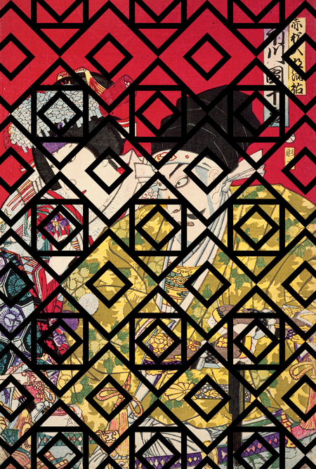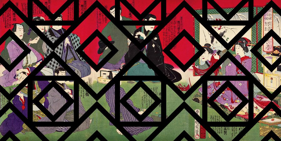 Утагава Кунисада. Актеры Савамура Генносукэ IV в роли Оуме, Накамура Араджиро I в роли Танго, Оноэ Кикутаро V в роли Канаи Тамигоро, Отани Монзо III (позже Отани Баджу V) в роли Томодзо и Накамура Цурузо II в роли Кёзо. 1883–1886
