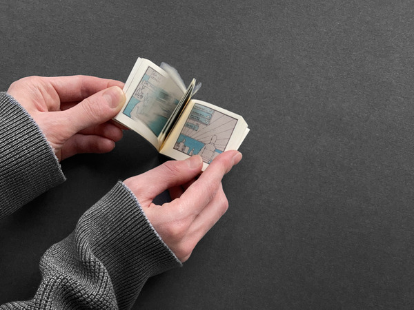 Потом я взяла флипбук. В нем не было текста, а нарратив представлял собой ускоренно показанный переходный этап жизни героини. После насыщенных книжных полос это дало возможность сделать передышку, а также заглянуть в будущее девушки, где произошли значительные изменения. Появились персонажи, которых ранее не было. Я поняла, что в одном из следующих форматов увижу последствия этих изменений более подробно. Так и произошло, когда я взяла в руки газету и увидела героиню на фоне яркого летнего пригорода.