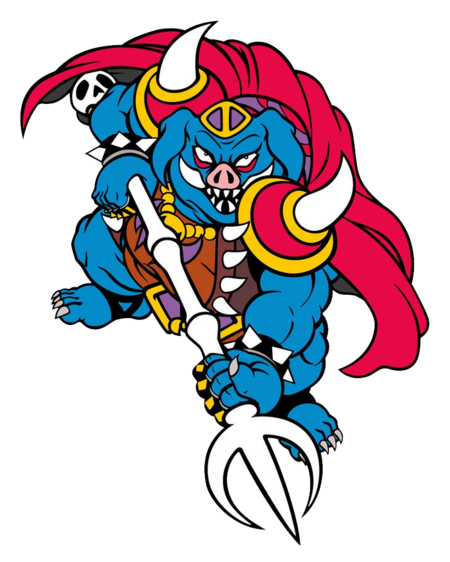 Визуальная мощь: Несмотря на ограниченную цветовую палитру, в дизайне передается его мощь. Темно-синяя кожа и красная броня с золотисто-желтыми вставками создают контрастную и угрожающую цветовую схему. Его огромные по меркам игры размеры сразу дают понять, что он главное испытание. Оружие: В его руках мы впервые видим гигантский трезубец, уникальный дизайн которого становится его визитной карточкой. Он не использует меч, как Линк, а сражается именно трезубцем — оружием, ассоциирующимся с морскими демонами и дьяволом, что подчеркивает его статус противоположности главного героя.