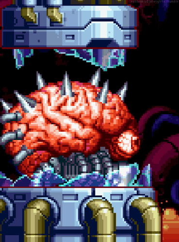 Биомеханика и сюрреализм: Ее дизайн сочетает в себе жуткую смесь органики и механики. Гигантский, пульсирующий мозг в стеклянной колбе, подключенный к сети трубок и механизмов, выглядит одновременно и живым, и искусственным. Это создает ощущение чего-то глубоко чуждого и противоестественного. «Лицо» как интерфейс: Ее самый запоминающийся элемент — большой, похожий на глаз, зрачок в центре «лба». Это скорее не биологический орган, а скорее сенсор или оптический прицел. Когда она готовит свой смертоносный луч, этот «глаз» светится ярко-розовым, фокусируя на себе все внимание игрока. Это ее «лицо», через которое она выражает безразличную, машинальную злобу. Эволюция формы: Дизайн Матери Брейн в Super Metroid стал каноническим, но кульминацией является ее вторая форма. После кажущегося поражения ее остатки сливаются с механической «ходульной» платформой, превращаясь в гигантского, двуногого кибернетического монстра. Этот переход от статичного «мозга в банке» к агрессивному, подвижному титану визуально шокирует и многократно усиливает чувство угрозы.