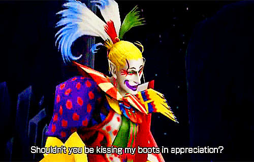 Образ Шута-Демона: Его внешность — жуткая пародия на классического придворного шута. Ярко-красные, белые и синие тона его костюма, грим, напоминающий маску, и остроконечный колпак создают образ, который должен быть комичным, но вызывает лишь беспокойство. Этот дизайн является прямым отражением его роли: он — шут, который смеется над смертью и разрушением.
