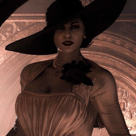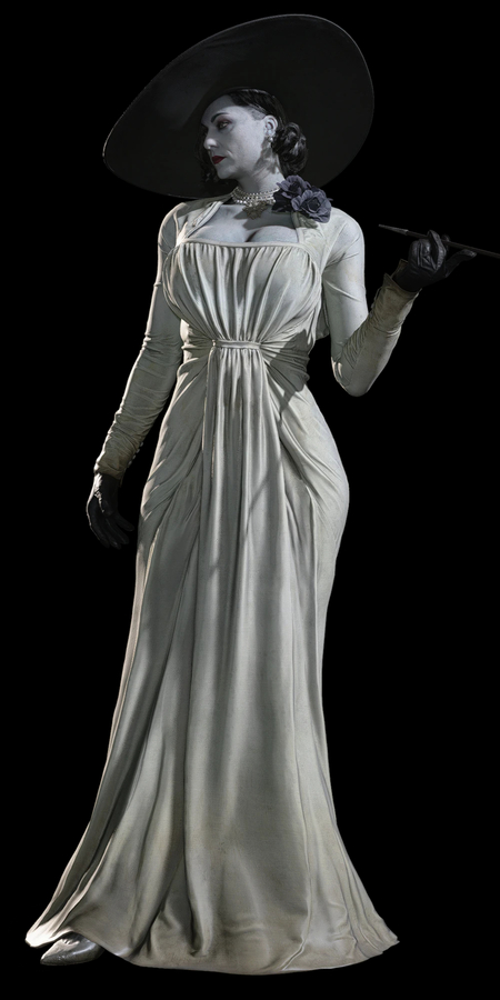 Архетип вампирши-аристократки: Её образ безупречен: длинное белое платье, широкая чёрная шляпа и белые перчатки. Она выглядит как благородная дама из другой эпохи. Эта внешняя утончённость резко контрастирует с её жестокой и хищной натурой, создавая мощный эффект обмана. Гиперболизированная статность: Её рост 2.9 метра — центральная черта её дизайна. Она буквально возвышается над Итаном (и игроком), что визуально передаёт её доминирование и угрозу. Контраст между красотой и чудовищностью: Изначально она предстаёт как невероятно стильная и красивая женщина. Однако при близком рассмотрении видны тревожные детали: неестественно бледная кожа, жёлтые глаза с вертикальными зрачками и, что самое главное, когти, похожие на стальные лезвия, которые она выпускает из перчаток.